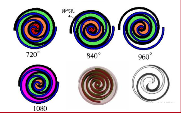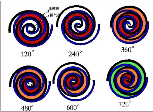 在壓縮過程中,渦旋定子(靜盤)保持固定,而渦旋轉子(動盤)則每隔90°順時針圓周運動,氣腔內的氣體即被壓縮成高壓氣體,并經渦旋中間的排氣口排出。
