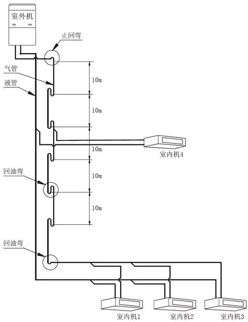 當(dāng)系統(tǒng)室內(nèi)外機(jī)之間存在落差時(shí),氣管的立管部分從下往上每隔10m 處安裝一個(gè)存油彎。