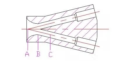 文丘里管型分流頭結構十分簡單,只有本體,不帶其它零部件,但加工困難。從熱力膨脹閥出口的制冷劑兩相混合物,由分流頭進口A流經收縮口B時,雖流速較高,壓力降較大,但流線平順,不與管壁脫離,使氣液兩相流體均勻地進入圓環形流道C中,由于管內收縮與擴張段采用平滑過渡,制冷劑在整個流動過程中不產生紊流,所以文丘里管型分流頭阻力較小,對安裝位置無特殊要求。