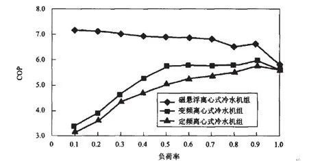 因此,雖然在不同負荷運行條件下,COP曲線呈現(xiàn)出衰減趨勢,但在70%的負荷范圍內(nèi),COP曲線整體呈現(xiàn)水平狀態(tài),節(jié)能效果明顯優(yōu)于其他兩種形式的離心冷水機組。