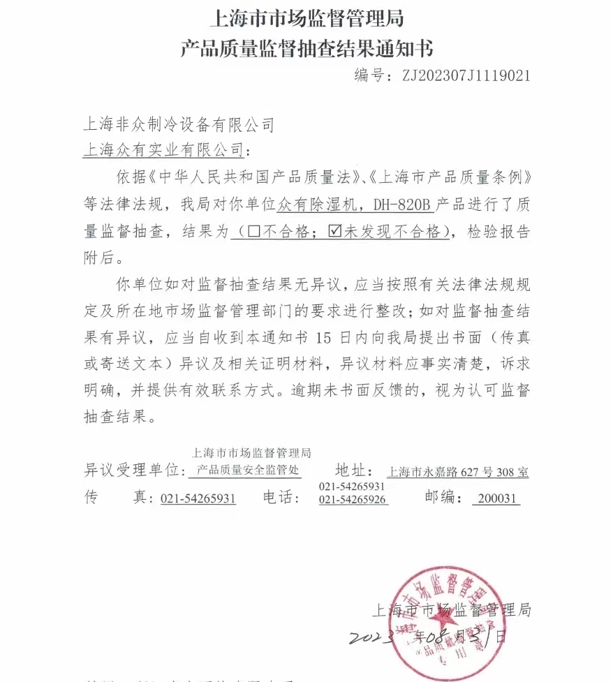 近日,上海市市場(chǎng)監(jiān)督管理局依據(jù)《中華人民共和國(guó)產(chǎn)品質(zhì)量法》、《上海市產(chǎn)品質(zhì)量條例》等法律法規(guī)對(duì)上海眾有實(shí)業(yè)有限公司的除濕機(jī)系列產(chǎn)品進(jìn)行了質(zhì)量監(jiān)督抽查,隨機(jī)抽查了DH-820B型號(hào)除濕機(jī)。此次抽查共檢驗(yàn)了“對(duì)觸及帶電部件的防護(hù)”、“耐潮濕”、“發(fā)熱”等21項(xiàng),報(bào)告顯示21項(xiàng)結(jié)果均為合格。