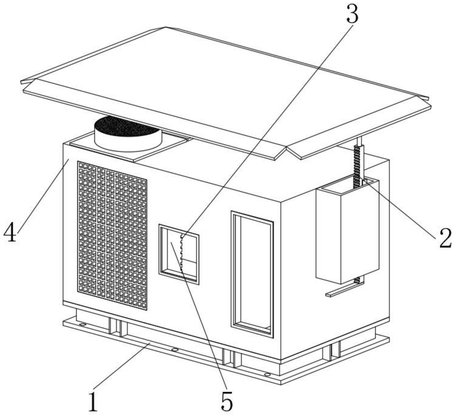 一體式的屋頂空調(diào)機(jī),專利號:ZL 2024 2 0258431.7,涉及空調(diào)技術(shù)領(lǐng)域,而本實用新型包括槽鋼底座,槽鋼底座的頂端固定連接有空調(diào)機(jī)本體,空調(diào)機(jī)本體的內(nèi)部設(shè)置有散熱片,空調(diào)機(jī)本體的上內(nèi)壁設(shè)置有配合散熱片使用的清理組件,空調(diào)機(jī)本體的一端上部設(shè)置有防雨組件,防雨組件包括連接殼,連接殼的一端與空調(diào)機(jī)本體的一端上部固定連接,連接殼的一側(cè)內(nèi)壁固定連接有第一支座,第一支座的頂端固定連接有第一電機(jī),且第一電機(jī)的輸出端固定連接有第一錐齒輪,本實用新型通過設(shè)置防雨組件,起到便于使得空調(diào)機(jī)具有防水功能的作用,提高了空調(diào)機(jī)的實用性,通過設(shè)置清理組件,起到便于對空調(diào)機(jī)中的散熱片表面灰塵進(jìn)行清理的作用,提高了空調(diào)機(jī)的使用效果。