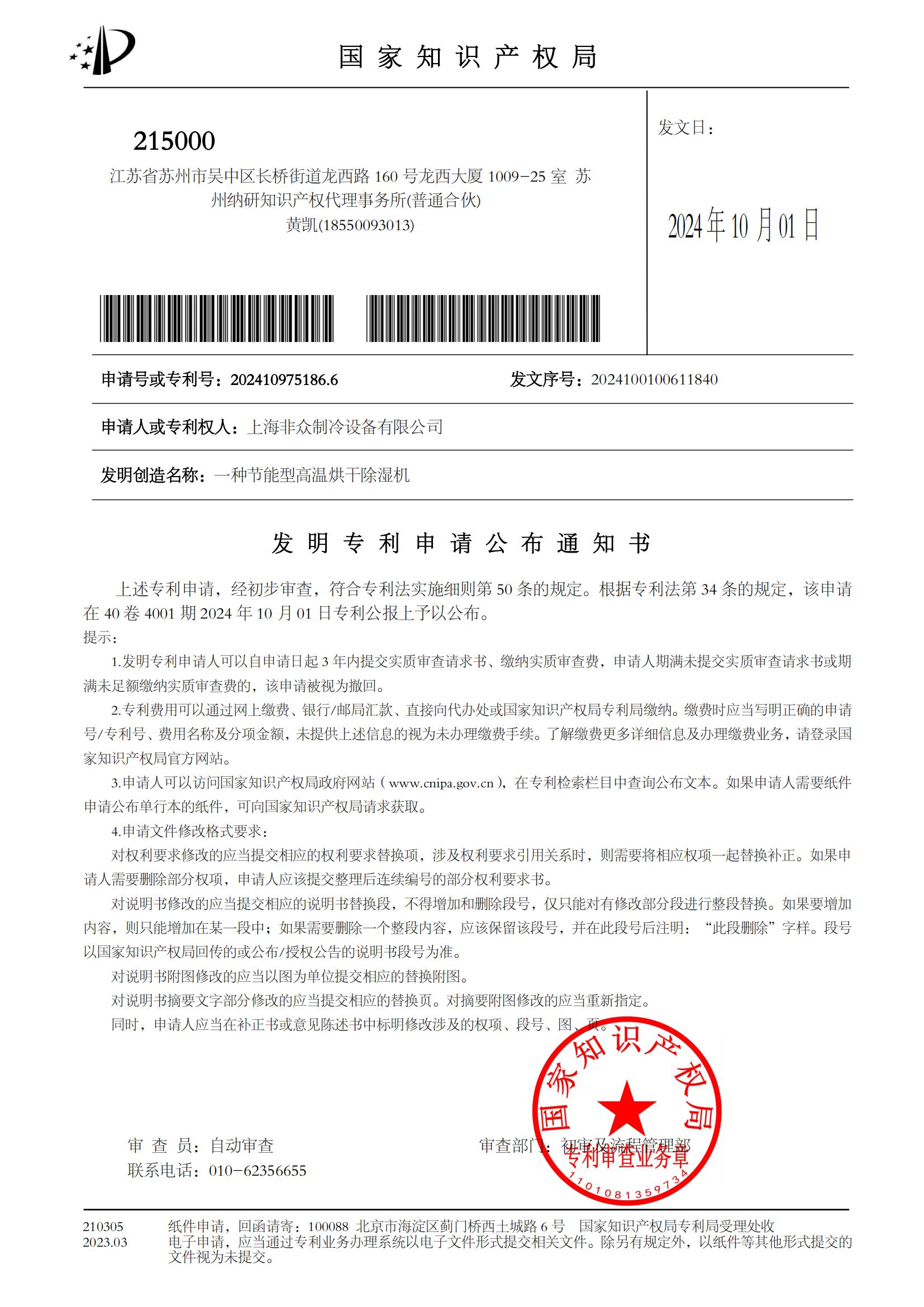 熱烈祝賀上海非眾制冷“一體式的屋頂空調(diào)機(jī),專利號:ZL 2024 2 0258431.7”實用新型專利獲得國家知識產(chǎn)權(quán)局授權(quán),取得專利證書并申請公布發(fā)明專利“ 一種節(jié)能型高溫烘干除濕機(jī),申請?zhí)柣驅(qū)@枺?/span>202410975186.6 ”