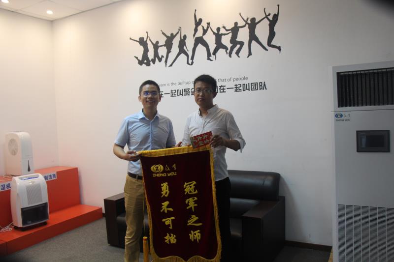 首先獎勵的是來公司僅僅4個月的銷售梁福華,在7月份炎炎夏日的高溫下不懼辛苦,勤勞務實主動見客戶,跑客業務、不言累、不畏險、始終堅定不移的做市場、做銷售、做客戶,功夫不負有心人,累水汗水與業績達成正比,梁工與一家公司一次性簽訂了53CFZ-8除濕機的大單,7月份總體銷售額高達36萬多,能攻下大單,難能可貴,充分展現出了一個優秀銷售員平時善于鉆研學習,沉心靜氣跑業務,不急不躁、不等不靠做業務的優秀品質,這樣的工作態度是我們每個人學習的榜樣。最后由郭總給梁工頒發錦旗并且給予了紅包獎勵。