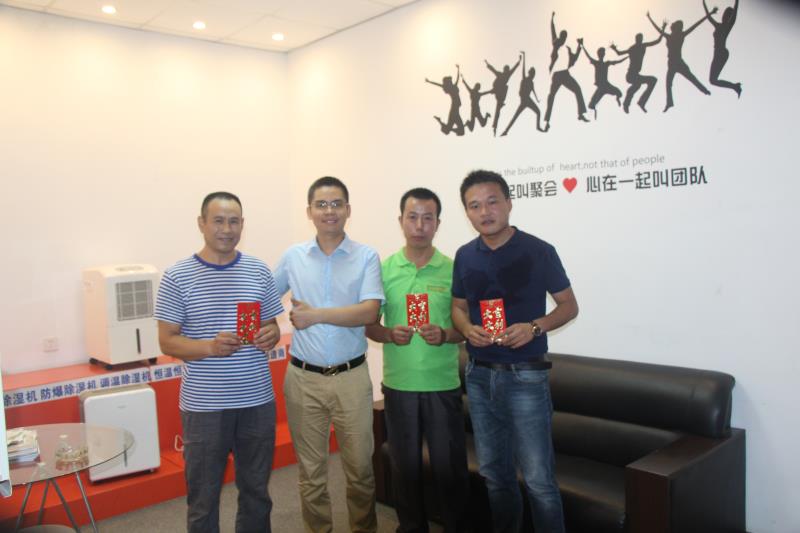 接下來獎勵的是技術部幸福,品質部王義久跟售后部王聚永三個人。7月19日公司接到浙江海亮股份有限公司的1臺調溫除濕機出現故障,公司當即成立了浙江海亮股份有限公司維修工作組。7月20日三人出發去諸暨,不怕苦、不怕臟、不怕累,反復檢測,細心排查,花費了大量時間和精力,終于找到了問題所在并辨清了產生問題的來由(屬客戶員工擅自操作不當所致機子壓縮機損壞),為公司挽回了名譽與損失。7月23日三人再次上門執行維修,犧牲周末休息時間,冒著高溫酷暑,就著惡劣的現場作業環境,扎下身子認真維修,甚至于通宵達旦(7月24日維修到次日凌晨5點),幾經辛苦勞累,機子終于回歸正常,大大提升并提供了公司的品牌與口碑,為公司帶來了效益和貢獻。經公司研究決定,現對幸福、王義久、王聚永三人以書面通報表揚并各自獎勵紅包200元。